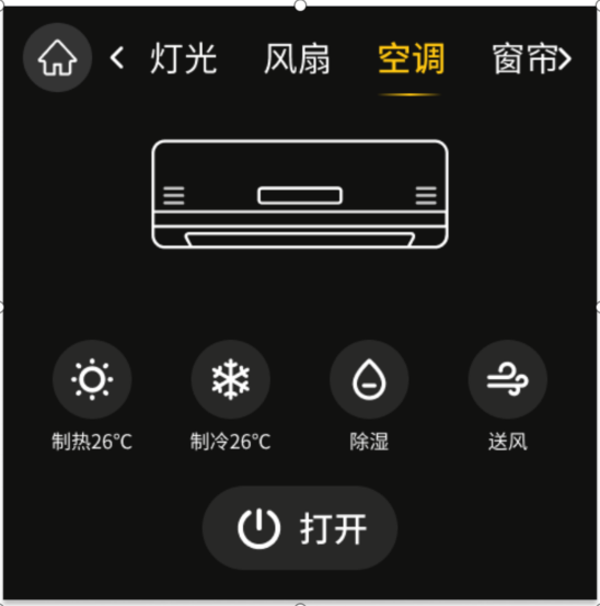 关于自定义空调类型,关闭和打开和四个模式的名称、布局位置、显示个数可自定义配置;其中特殊的打开按钮可配置绑定的模式。