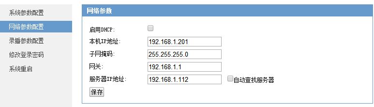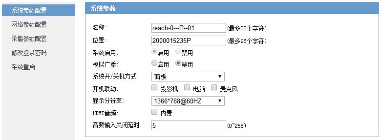 06.如果需要远程控制设备功能,请点击网络参数配置,为设备设定一个IP地址。在同一个网段时服务器IP地址建议自动获取,如在跨网段工作时,请给设备设定服务器的IP地址。 07.如果需要使用录播,请点击录播参数配置。 08.所有的参数设置完成后,点击系统重启,全部功能才能生效启用。
