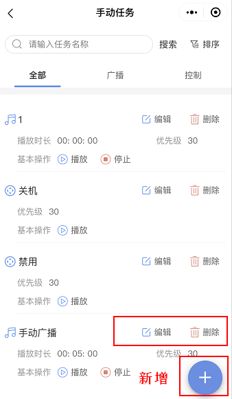 ①、新增:点击新增按钮可以新增模式任务,含广播任务与控制任务;