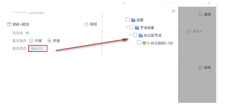 ①、开播:点击则打开BW801设备的广播推送,将会把此设备的广播推送至选择的成员设备(具体在按键设置中设置);