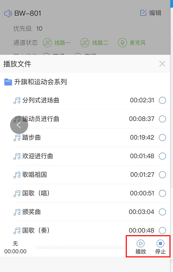 BC-01为网络机柜式终端,小程序端可以对其通道(音频、广播、话筒)进行控制,也可以选择BC-01设备的内存卡上的mp3文件进行播放,具体操作如下: