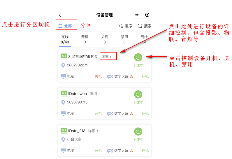 5.设备状态:上课中代表开机,点击可进行关机或禁用;闲置代表关机或禁用,点击可进行开机。