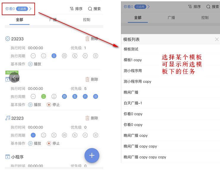 3.点击添加按钮,可在模板下添加广播任务或控制任务;