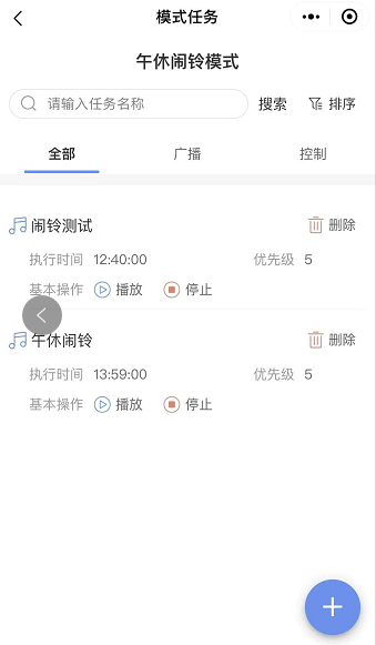 进入定时任务,任务列表按照执行时间先后排列显示。任务类型分控制任务与广播任务,如下图所示。
