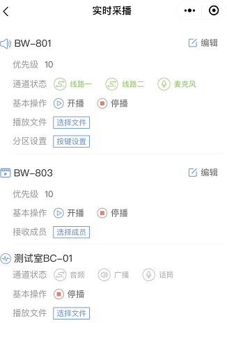 BW-801为数字音频广播站,小程序端可对其进行基本控制、对外推送广播、按键设置等,具体如下: