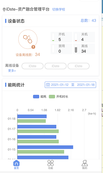 首页由设备状态和能耗统计构成。根据用户是否拥有各个模块的权限和模块下面的子权限来显示或隐藏该模块或子模块,并且,用户权限只在登录学校时获取,所以当用户权限变更时需要在学校列表,重新登录学校,权限变更才会生效。
