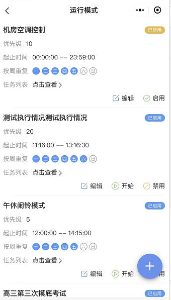1.模式状态:模式名称右侧显示模式的运行状态,共三种:启用、禁用、开始。已启用的模式,到达模式起止日期会自动执行、自动停止。