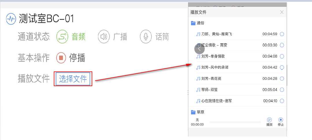 4.点击【播放文件】,弹出BC-01内存卡中的文件目录,选择文件后点击播放,即可播放文件,按停止则终止播放