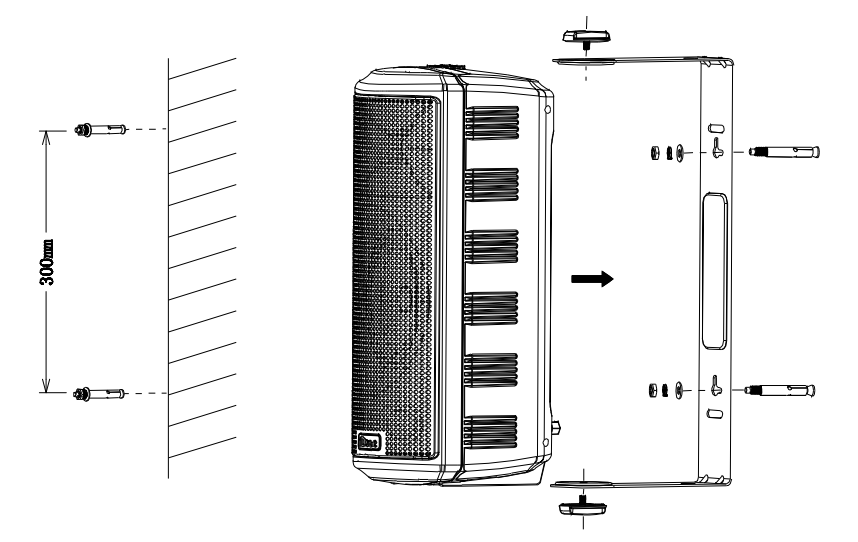 2.用旋钮螺栓将音箱和支架固定,挂到膨胀螺栓上并锁紧。