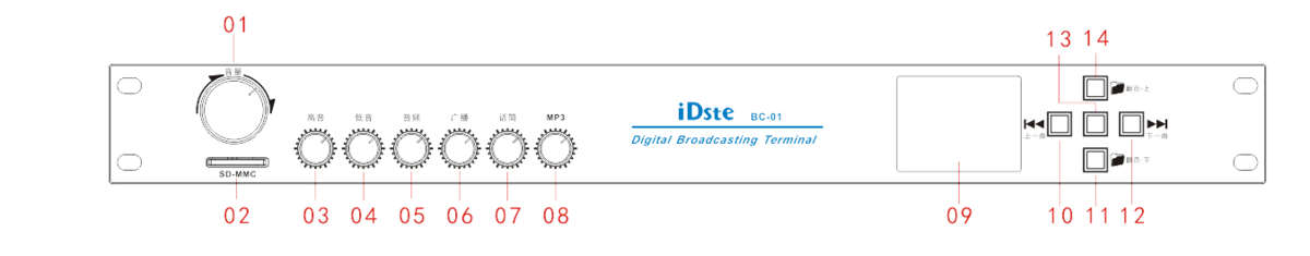 08.本地SD卡上MP3播放音量调节旋钮,可以根据音箱、环境、听众的要求调整音频的大小,顺时针旋转为增加,反之减小。