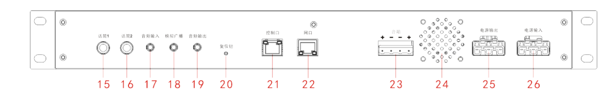 16.标准6.3mm话筒2输入端口,当按下前面板的话筒旋钮时,此通道为打开状态。