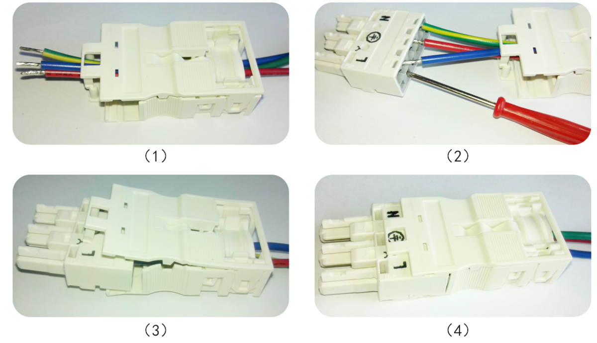 2. 用小螺丝刀插入方孔内,将内部弹片张开,分别将火线、零线、地线压入插头,在松开螺丝刀。