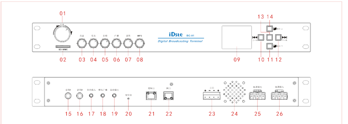 iDste BC系列数字广播终端产品采用工业级高速32位嵌入式CPU,内置128MB大容量FLASH存储器,Linux操作系统,应用多项最新 电子技术,采用先进的SMT贴片加工工艺和专业级多媒体核心器件,具备高效广播音频解码功能,结合广播服务器软件可直接实现教室终端的IP数字广播的解码输出,实现定时上下课铃等作息铃声广播及远程呼叫广播。 系统人机界面友好,操作简捷,安装维护方便,是一款实用性好,可靠性高,功能齐全,扩展性强的精品电教设备。