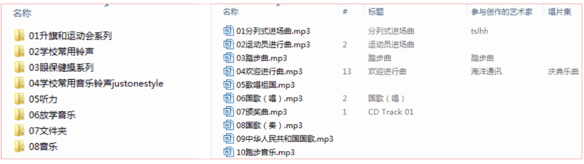 2. 建立播放文件:将音乐文件重命名为:01-11的编号+歌曲名(如 01国歌.mp3)。