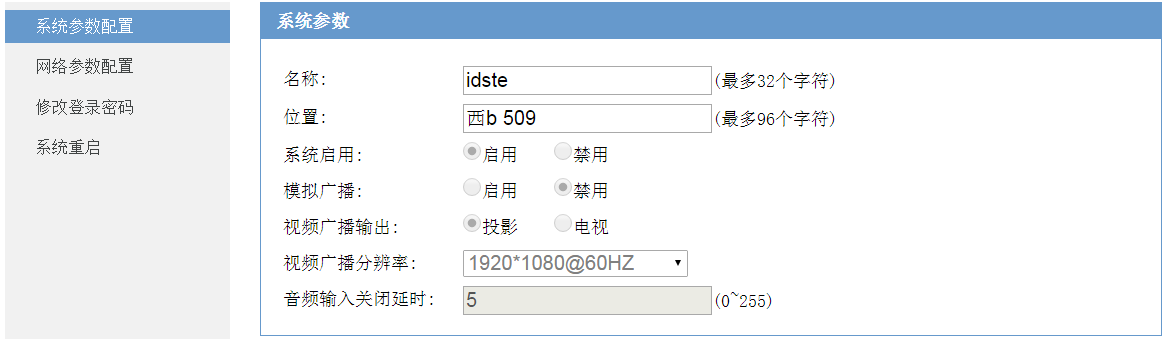 04.如果需要远程控制设备功能,请点击网络参数配置,为设备设定一个IP地址,也可以采用自动获取IP地址。在同一个网段时服务器IP地址建议自动获取,如在跨网段工作时,请给设备设定服务器的IP地址。 05.所有的参数设置完成后,点击系统重启,全部功能才能生效启用。