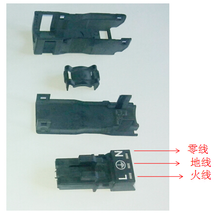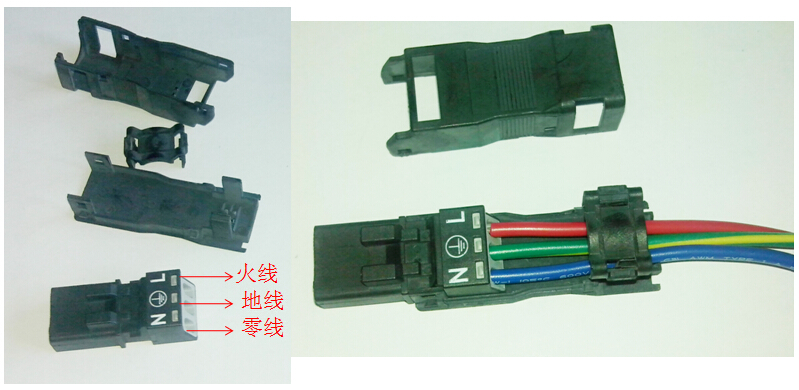 5.装护线盒: 将接好线的插头如图所示放入护线盒中,再将线卡包住电源线,与护线盒压紧,再扣上护线盒的上盖;