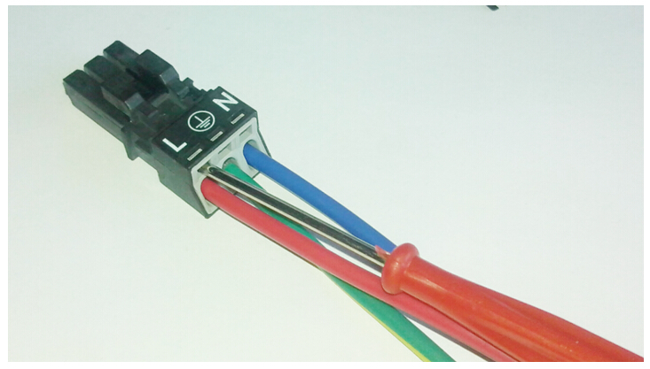 4.用螺丝刀插入万可插座的方孔内,使里面的弹片张开,将电源线的火线、地线、零线依次压入万可插座的圆孔内,松开螺丝刀,完成接线,接好后,再轻拉电源线应不被拉出来; PS:若导线是单股较硬的那种,可直接插入万可插座中,不用螺丝刀也可以!