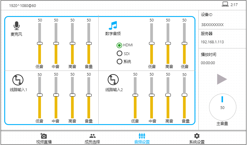 2.点击各通道图标,变蓝表示开启该通道,调节各滑块可以调节各通道音源的高音、低音等。
