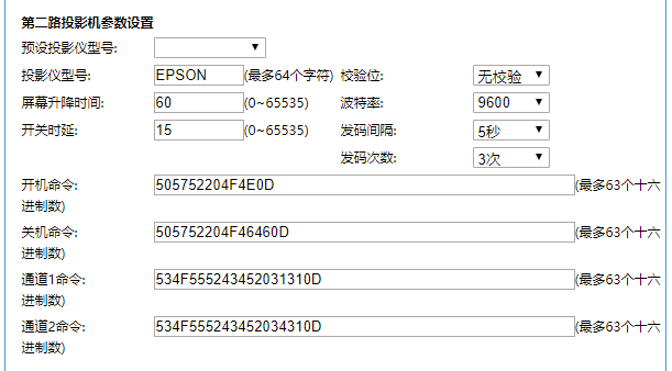 2. 在中控配置界面第二路投影机参数设置,配置HRC301需控制投影机的参数;