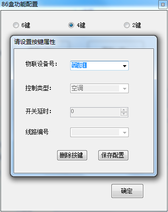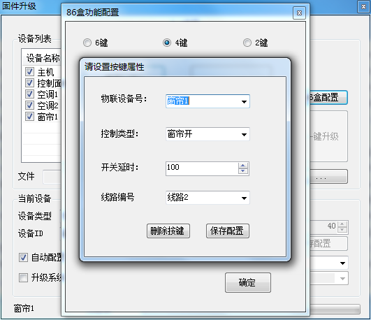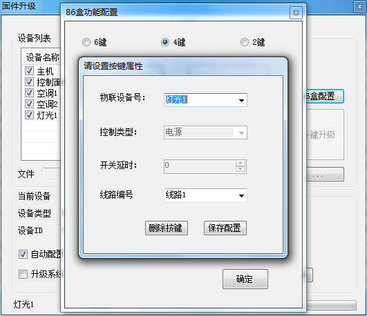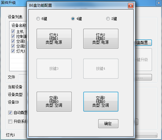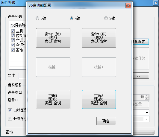 2.同时按下控制器中间两个按键5秒,控制器闪一次红灯,标志控制器已进入对频模式,必须在30s内点击控制台“手动连接”按钮,控制台界面红色提示灯变绿,设备列表中出现控制器相关信息,证明控制器与中控已经匹配好,点击“86盒配置”,按实际需求对每个按键功能进行配置,不用的按键,则不配置。以4键为例,在控制台界面如图所示: