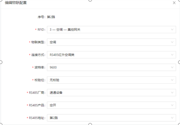 ➢物联类型:为物联类型设置中的类型,配置的物联类型列表中的RFID和物联类型对应匹配,当前支持的物联类型包括空调、电源、窗帘。