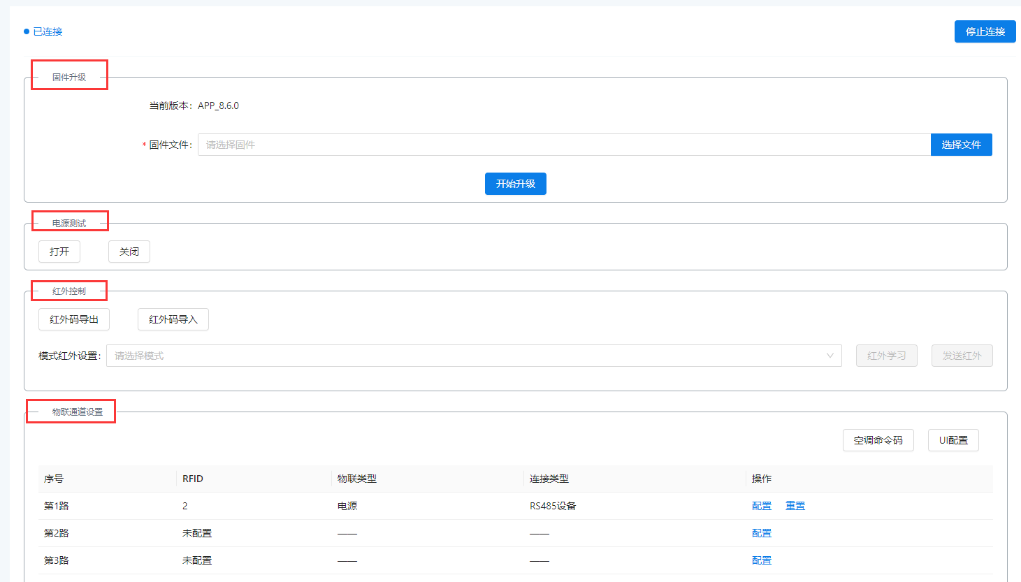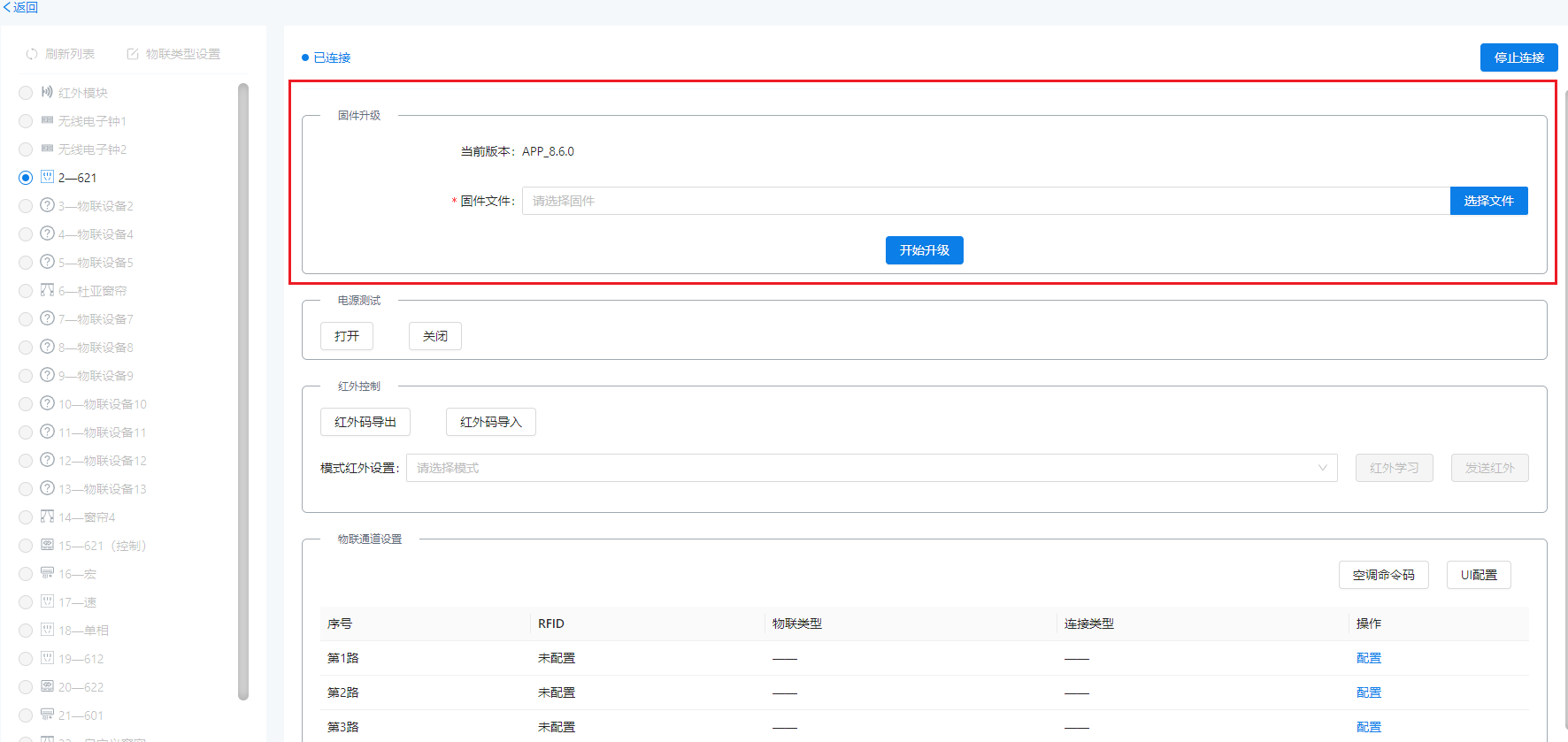 KC620物联终端界面:分为4个模块,固件升级模块,电源测试模块,红外控制模块,和物联通道设置模块。