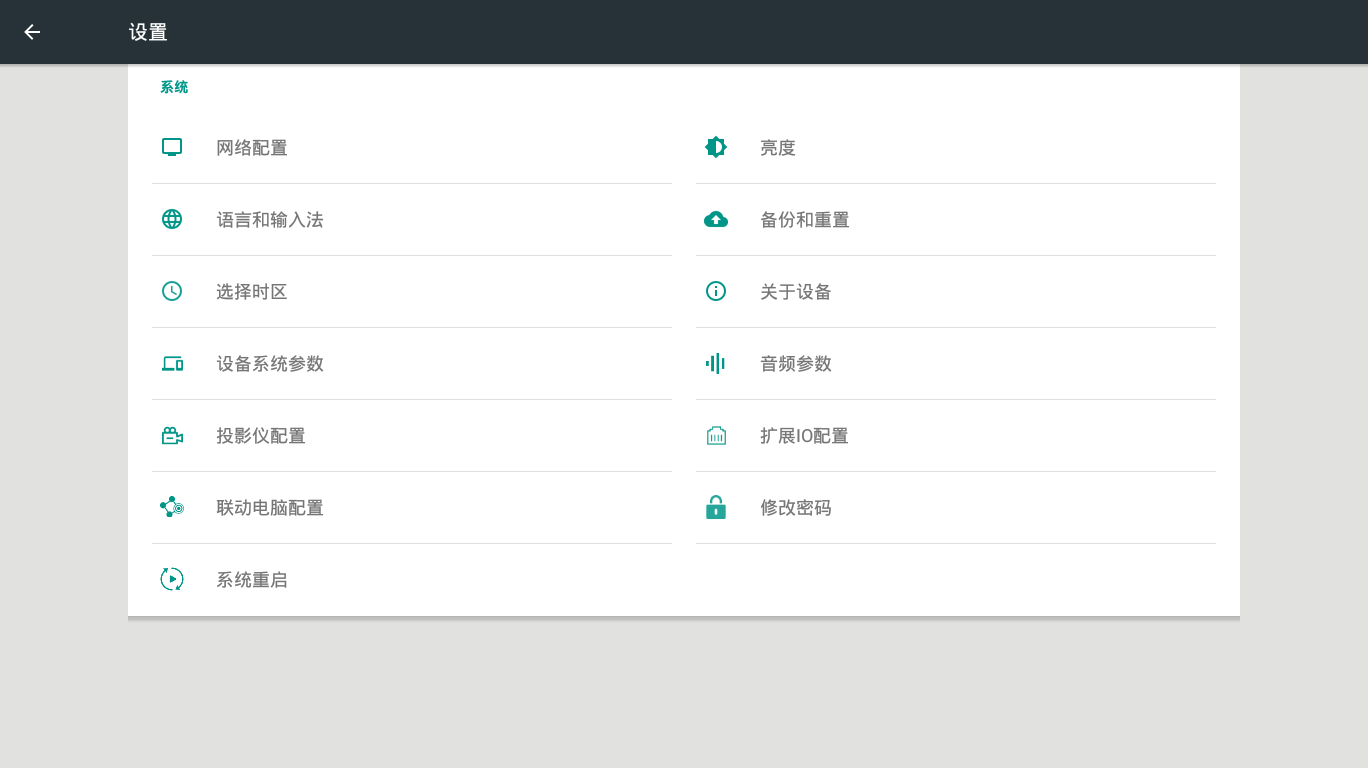 • 在关机状态下的主界面连续点击屏幕右下角6次,唤出密码输入框,输入初始密码admin,进入设备配置页面。