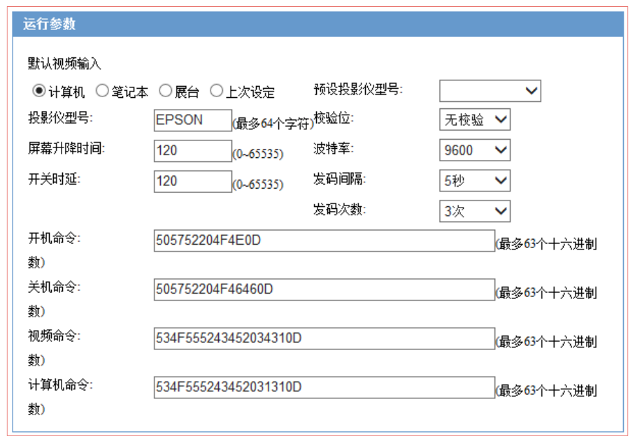 设置运行参数时,系统内置有几种投影仪控制码可选择。如果没有所需要的控制码,请按投影仪说明书上的信息,输入下方表格中,注意要在每个字符串后面都加上“0D”,点击保存。