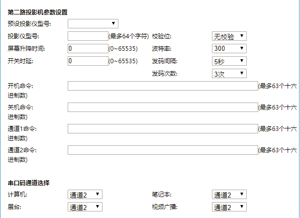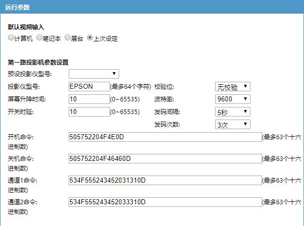 • 设置运行参数时,系统内置有几种投影仪控制码可选择。如果没有所需要的控制码,请按投影仪说明书上的信息,输入下方表格中,注意要在每个字符串后面都加上“0D”(零和大写的字母D),点击保存。配置第二路投影仪时,需要用HRC301进行连接。